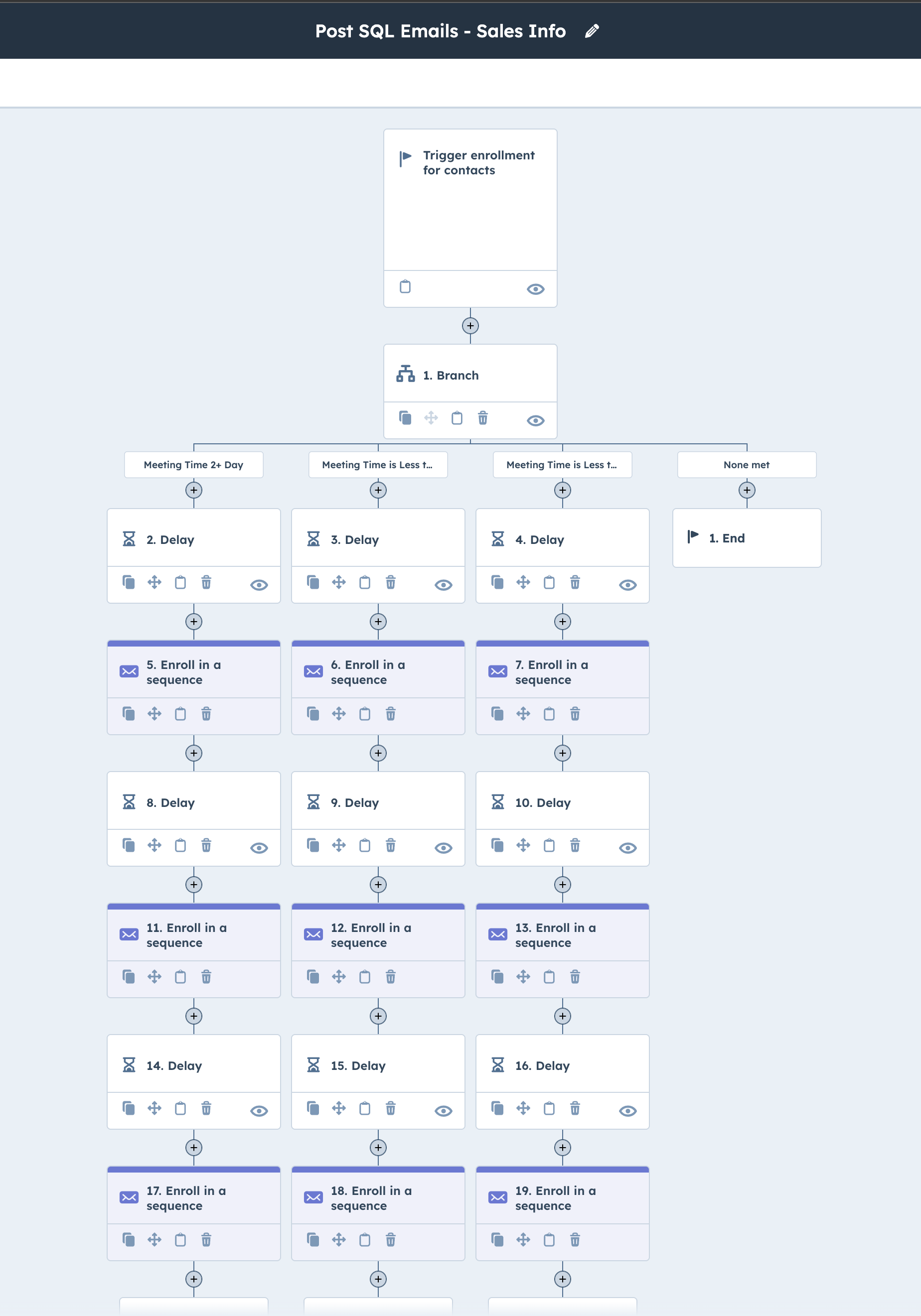 The sequence ran for 10–12 emails, then dropped them into a drip if no response.